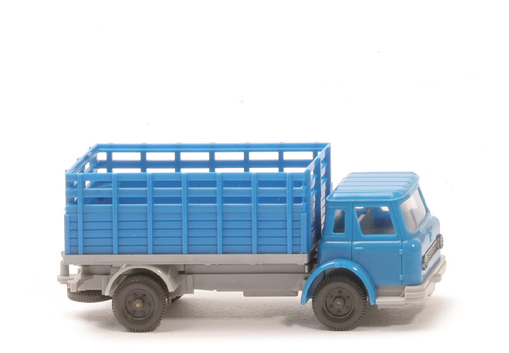 Farbe Kabine | himmelblau | Dachlüfter | ohne | Inneneinrichtung | silbergrau | Verglasung | klar | Chassis | silbergrau | Zughaken | ins Chassis integriert | Reserverad | am Heck unter Chassis | Pritsche | silbern | unterer Aufbau | geschlossen, verklebt | Farbe unterer Aufbau | himmelblau | oberer Aufbau | durchbrochen, gesteckt | Typ oberer Aufbau | ohne Steckhalterungen | Farbe oberer Aufbau | himmelblau | Bemalung Heck | Rückleuchten der Rücklichtstangen rot | Räder | 11mm, 6-Loch einteilig |