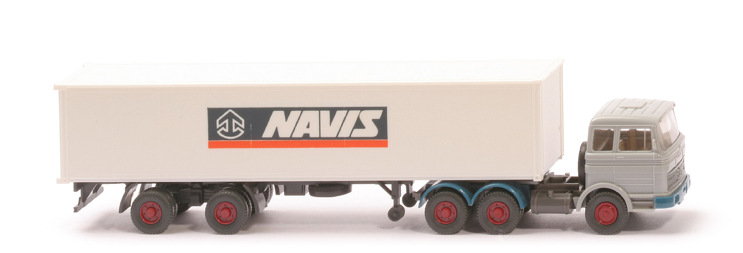 | Zugmaschine | Typ | Dach querversteift | Kabine | silbergrau | Spiegel | mit | Scheibenwischer | ohne | Lenkrad | mit | Inneneinrichtung | ca. hellgelbgrau | Stoßstange | azurblau | Chassis | basaltgrau, mit Zentriernippel | Radlauf hinten | zweiteilig, azurblau | Reserverad | hinter Kabine | Räder | Profil grob | Felgen | hellbraunrot | | Container | Art | 40 ft Glattwand | Farbe | weiß | Türen | neu | Beschriftung | Navis (s. Foto) | Beschriftung Art | klein (ca. 50 mm) | | Auflieger | Farbe | anthrazit | Unterfahrschutz | mit | Königsbolzen | stark | Räder | Profil grob | Felgen | hellbraunrot |