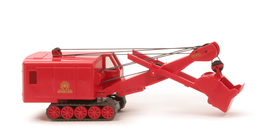 Autodrom "Klassische Baufahrzeuge X". Das Rot der Baufahrzeugserie Autodrom (1996 bis 2006) ist dunkler als das Rot der frühen Modelle. Oberwagen und Unterwagen sind durch den Weichzapfen verbunden, den wir von den Königsbolzen-Verbindungen kennen. Die Verbindungen Oberwagen/Ausleger und Ausleger/Löffelstiele laufen über Metallachsen. |