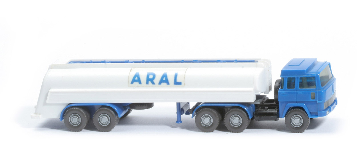 | Zugmaschine | Kabine oben | dunkelsignalblau | Kabine unten | maritimblau | Verglasung | getönt | Inneneinrichtung | ca. hellgelbgrau | Lenkrad | ohne | Grill | silber | Chassis | schwarz | Radlauf hinten | kobaltblau | Sattelpfanne | für großen Königsbolzen | Reserverad | hinter Kabine | Räder | Profil grob | Radkappen | silber | | Auflieger | Farbe Tank | weiß | Farbe Füllanlage | helles kobaltblau | Farbe Armaturen hinter Klappe | helles kobaltblau | Farbe Chassis | helles kobaltblau | Beschriftung Seite | Aral | Beschriftung Heck | Aral | Beschriftung - Art | Folien | Achseinheit - Farbe | dunkelsignalblau | Typ Achseinheit | Germany/Wiking | Bodenprägung Chassis | Wiking, ohne 80 S | Königsbolzen | groß | Reserverad | mit | Räder | Profil grob | Radkappen | silber |