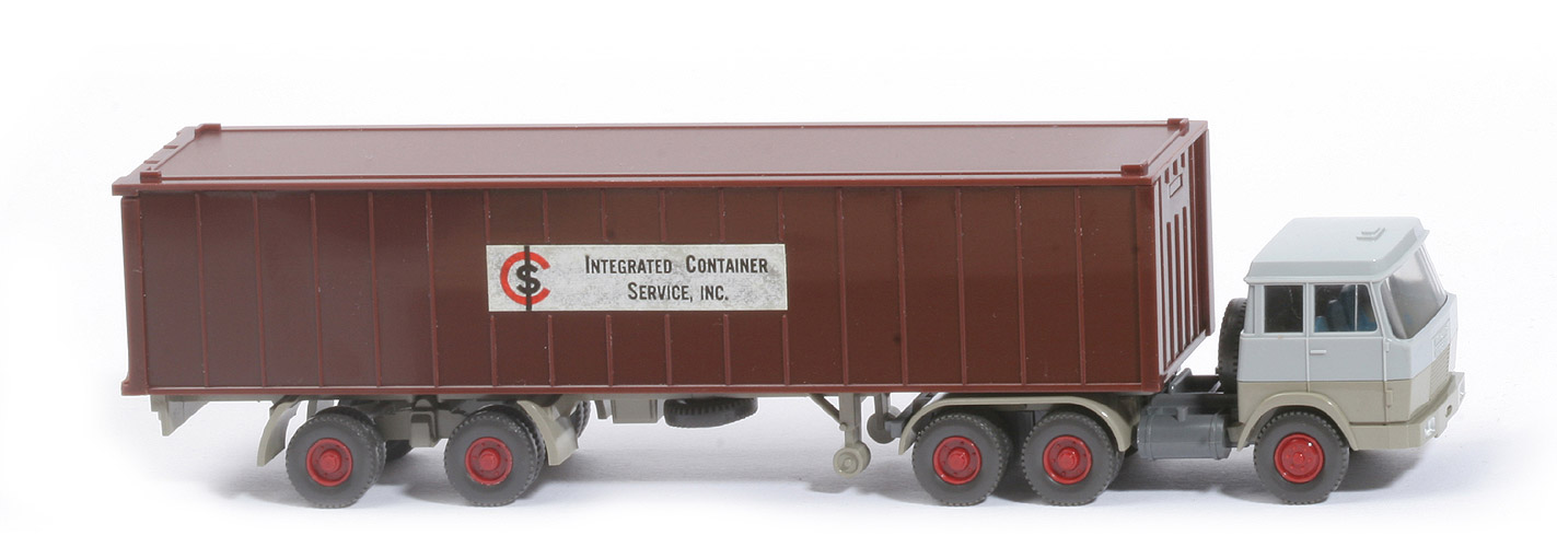 | | Zugmaschine | | Kabine oben | silbergrau | | Kabine unten | olivgrau | | Verglasung | getönt | | Inneneinrichtung | 3 Sitze, azurblau | | Lenkrad | ohne | | Chassis | basaltgrau | | Radlauf hinten | olivgrau, einteilig | | Sattelpfanne | für großen Königsbolzen | | Reserverad | hinter Kabine | | Räder | Profil grob | | Felgen | hellbraunrot | | | Container | | Art | 1 x 40 ft gerippt | | Farbe | schokobraun | | Beschriftung | ICS (s. Foto) | | Beschriftung Art | 5 Felder, Papieraufkleber | | | Auflieger | | Farbe | olivgrau | | Unterfahrschutz | ohne | | Königsbolzen | stark | | Räder | Profil grob | | Felgen | hellbraunrot |