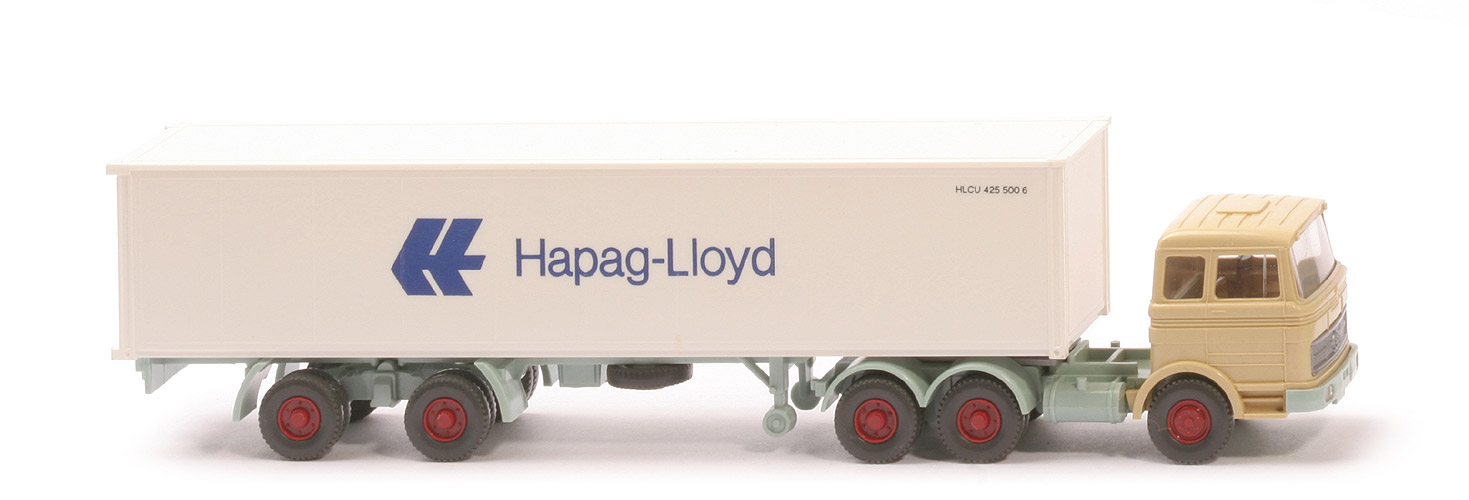 | Zugmaschine | Typ | Dach querversteift | Kabine | elfenbein | Spiegel | ohne | Scheibenwischer | ohne | Lenkrad | ohne | Inneneinrichtung | ca. braunmetallic | Stoßstange | lichtgrün | Chassis | lichtgrün | Radlauf hinten | zweiteilig, lichtgrün | Reserverad | ohne | Räder | Profil grob | Felgen | hellbraunrot | | Container | Art | 40 ft Glattwand | Farbe | weiß | Türen | alt | Beschriftung | Hapag-Lloyd (s. Foto) | Beschriftung Art | 36mm, mit Nummer (Serie) | | Auflieger | Farbe | lichtgrün | Unterfahrschutz | ohne | Königsbolzen | stark | Räder | Profil grob | Felgen | hellbraunrot |