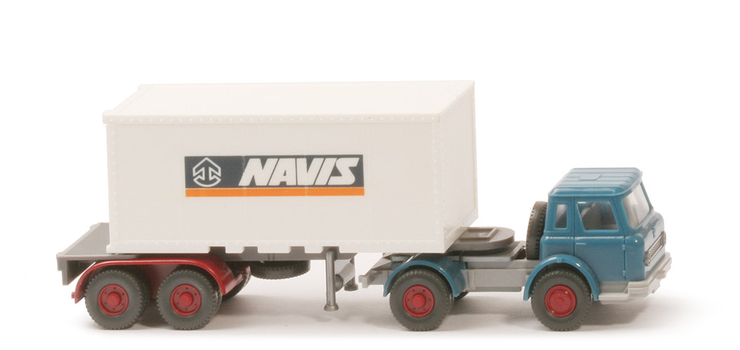 | Zugmaschine | Kabine | azurblau | Lüfter | mit | Inneneinrichtung | silbergrau | Verglasung | klar | Chassis | silbergrau | Radlauf hinten | azurblau | Sattelpfanne | für großen Königsbolzen | Reserverad | hinter Kabine | Räder | Profil grob | Felgen | hellbraunrot | | Container | Art | 20 ft Glattwand | Farbe | weiß | Türen | alt | Beschriftung | Navis (s. Foto) | Beschriftung Art | Druck stahlblau/orange | | Auflieger | Farbe | basaltgrau | Variante | mit Markierung, mit Bohrungen neben KoBo | Reserverad | unter Auflieger, gesteckt | Bodenprägung | 52h | Doppelachsaggregat Farbe | hellbraunrot | Doppelachsaggregat Typ | Klemmplatte WIKING u. GERMANY | Hydraulikstützen | silbern, gesteckt | Räder | Profil grob | Felgen | hellbraunrot |