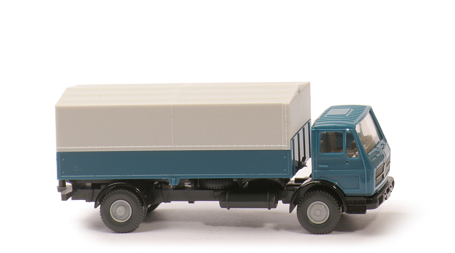 Kabine | azurblau | Spiegelaufnahmen | mit | Grill | eingesetzt, mit Silberstreifen neben Stern | Verglasung | klar | Inneneinrichtung | Lenkrad integriert, ca. graubeige | Stoßstange, vorderer Kotflügel | schwarz | Typ vorderer Kotflügel | ohne Wulst | Scheinwerfer | unbemalt, mit integrierten Blinkern | Chassistyp | Zughaken auf Dreieck | Chassisfarbe | anthrazit | Radlauf hinten | schwarz | Reserverad | mittig unter Prtische | Pritsche | azurblau, Seiten glatt, mit vier Schließungen je Seite | Pritschengestell | anthrazit | Pritscheneinlage | lichtgrau | Plane Farbe | altweiß | Plane Typ | hoch, hinten geschlossen, Steckleisten vorne und hinten | Beschriftung | ohne | Räder | 12mm, Profil grob | Felgen | 6-Loch, ca. silbergrau |