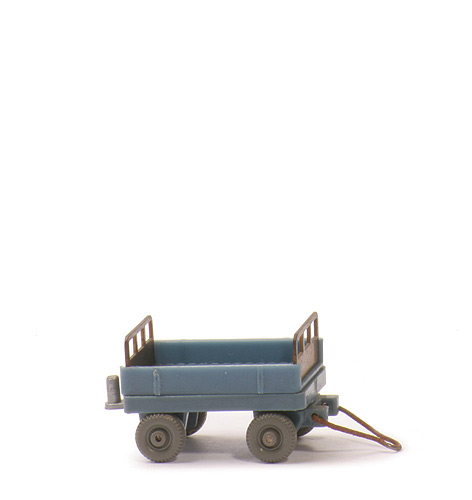 Pritsche | ~mattgraublau | hier Bodenprägung | WM | Drehschemel | ~mattgraublau, mit Hilfsteil vernietet | Zughaken | silbern, angeklebt | Aufbau | ~mattgraublau | Gitter | Metall | Deichsel | Metall, kurz | Räder | ca. 7 mm, betongrau |