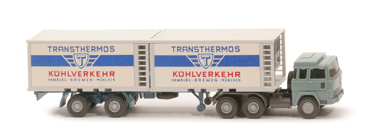 | Zugmaschine | Kabine oben | grünblau | Kabine unten | grünblau, Scheinwerfer gesilbert | Verglasung | getönt | Inneneinrichtung | ca. olivgrau | Lenkrad | ohne | Grill | silber | Chassis | staubgrau | Radlauf hinten | staubgrau, 1-teilig | Sattelpfanne | für großen Königsbolzen | Reserverad | hinter Kabine | Räder | Profil grob | Felgen | 6-Loch, silbergrau | | Container | Art | 2 x 20 ft Kühlcontainer | Farbe | weiß | Kühlaggregat | silbern | Türen | alt | Beschriftung | Transthermos (s. Foto) | Beschriftung Art | ganzflächiger Papieraufkleber | | Auflieger | Farbe | azurblau | Unterfahrschutz | ohne | Königsbolzen | stark | Räder | Profil grob | Felgen | 6-Loch, silbergrau |