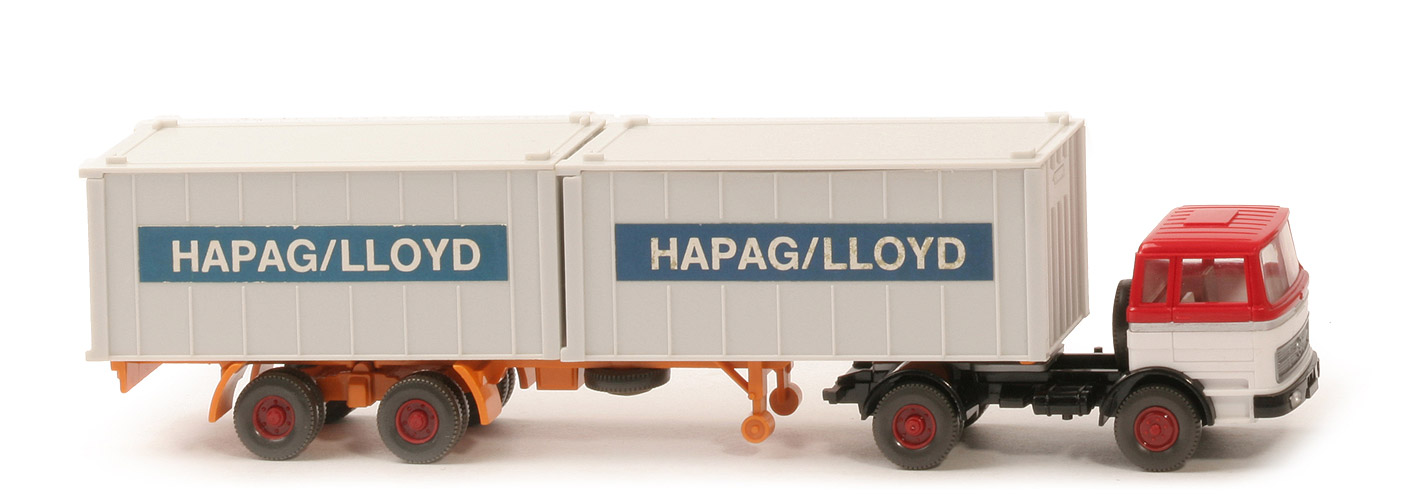 | Zugmaschine | Kabine oben | rot | Kabine unten | weiß | Streifen | mit | Verglasung | klar | Inneneinrichtung | ca. lichtgrau | Lenkrad | ohne | Grill | silbern | Stoßstange, Radlauf vorn | schwarz | Chassistyp | alt | Chassisfarbe | schwarz | Radlauf hinten | schwarz | Reserverad | hinter Kabine | Sattelpfanne | neu, für dünnen Bolzen | Räder | 12mm, Profil fein | Felgen | hellbraunrot | | Container | Art | 2 x 20 ft gerippt | Dach | altweiß | Korpus | altweiß | Türen | altweiß | Beschriftung | Hapag-Lloyd (s. Foto) | Beschriftung Grösse | 7 Felder, Papieraufkleber | | Auflieger | Farbe | gelborange (Werbe) | Unterfahrschutz | ohne | Königsbolzen | dünn | Räder | 12mm, Profil fein | Felgen | hellbraunrot | | Link | Schwestermodell | mit 1 x 40 ft Container |