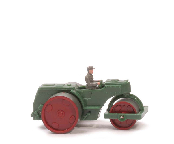 Farbe Karosserie | hellpatinagrün | Halterung für Dach | ohne | Herstellerkennzeichnung | Prägung Heck Fahrerseite: WIKING | Herkunftskennung | Prägung Heck andere Seite: Germany | vordere Walzenhalterung Farbe | hellpatinagrün | hier Ausführung | Achsführung verstärkt | hier Befestigung | Arretierung von oben mit kleinem Nippel | Lenkrad Farbe | hellpatinagrün | Lenkrad Ausführung | Vollmaterial | Fahrer | mit, ca. basaltgrau | Bemalung Fahrer | Gesicht, Hände | Walzen Grundfarbe | ca. weinrot | Silberung der Laufflächen | mit |