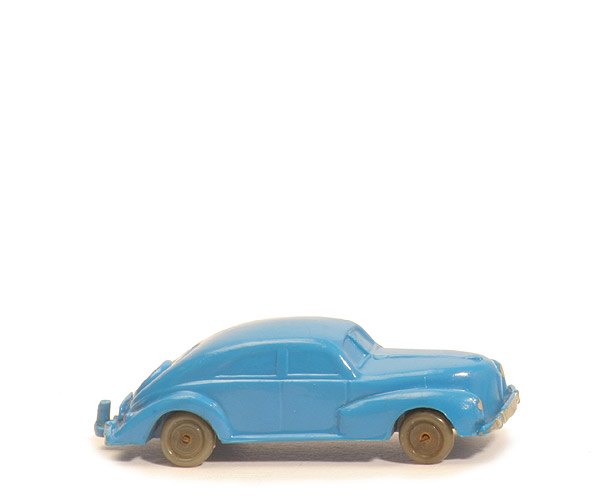 Achsen | Drahtachser | Typ | Haube gerundet ("spitz") | Farbe Karosserie | himmelblau | Frontscheibe | geteilt | Kühlergrill | ein senkrechter Steg | hintere Stoßstange | geteilt, integrierter Zughaken | Zughaken | Zughaken integriert | Bodenprägung | WM Germany | Bemalung Scheinwerfer | silbern | Bemalung Kennzeichen vorne | silbern | Bemalung Stoßstange vorne | silbern | Bemalung Rückleuchten | rot | Bemalung Kennzeichen hinten | ohne | Bemalung Stoßstange hinten | silbern | Räder Typ | Nabe gewölbt | Räder Farbe | staubgrau |