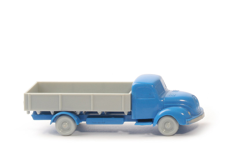 Achsen | Rollachser | Version Kabine | Typ 1a | Kabine unten | ohne Bohrungen | Farbe Kabine u. Chassis | himmelblau | Verstärkung Trittbretter | ohne | Bemalung Kabine | Scheinwerfer, Stoßstange | Chassis Farbe | himmelblau | Version Chassis | Version 1a | Bodenprägung | WM im Kreis | Pritsche | Seiten glatt | Farbe Pritsche | silbergrau | Zughaken | nach unten | Zapfen | Rundzapfen | Kennzeichen | bemalt silbern | Räder | sog. Porzellanräder |