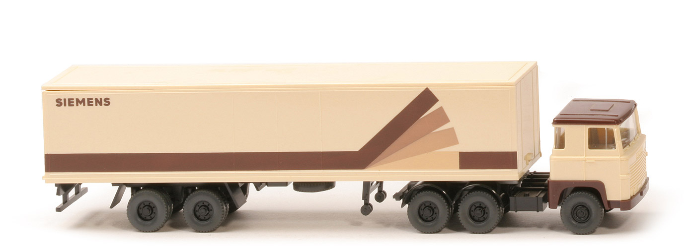 | Zugmaschine | Dach | schokobraun | Kabine oben | creme | Kabine unten | creme | Stoßstange | schokobraun | Scheinwerfer | 2, ungesilbert | Spiegel | mit | Scheibenwischer | mit | Lenkrad | mit | Sattelpfanne | für großen Königsbolzen | Reserverad | ohne | Chassis Farbe | schwarz | Räder | 12mm, Profil grob | 8-Loch-Felgen | schwarz | | Koffer | Art | links glatt, rechts Tür | Dach | creme | Korpus | creme | Türen | creme | Beschriftung | ohne Werbesatz ... (s. Foto) | Chassis | schwarz | Kotflügel | gerade | Unterfahrschutz | mit | Königsbolzen | stark | Räder | 12mm, Profil grob | 8-Loch-Felgen | schwarz |