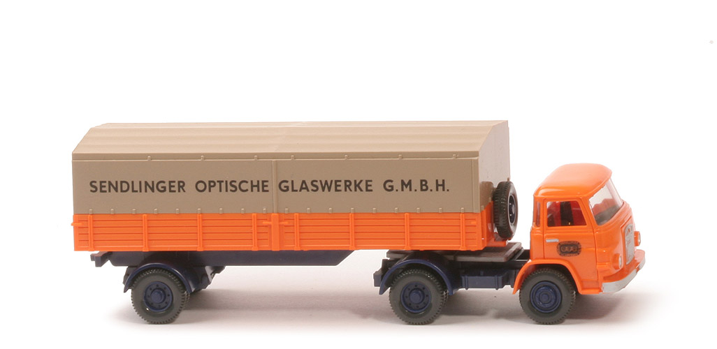 | Zugmaschine | Farbe Kabine | orangegelb | Verglasung | klar | Inneneinrichtung | schwarz, Lkr integriert | Grill | integriert, Umrandung, "MAN, Diesel" silbern gedruckt | Chassis | hellstahlblau, ohne Zughaken | Bedruckung | Scheinwerfer | Sattelpfanne | für großen Königsbolzen | Radlauf hinten | schwarz | Bodenprägung | neues WIKING-Logo | Reserverad | ohne | Räder | 11 mm 2-teilig | Felgen | 8-Loch, hellstahlblau | | Auflieger | Pritsche Art | Holzpritsche | Pritsche Farbe | orangegelb | Pritscheneinlage | silbern | Chassis | hellstahlblau | Bodenprägung | neues WIKING-Logo | Radlauf | Typ 2, hellstahlblau | Reserverad | stirnseitig | Plane | ca. graubeige | Bedruckung Plane | "Sendlinger Optische Glaswerke G.m.b,H." | Räder | 11 mm 2-teilig | Felgen | 8-Loch, hellstahlblau |