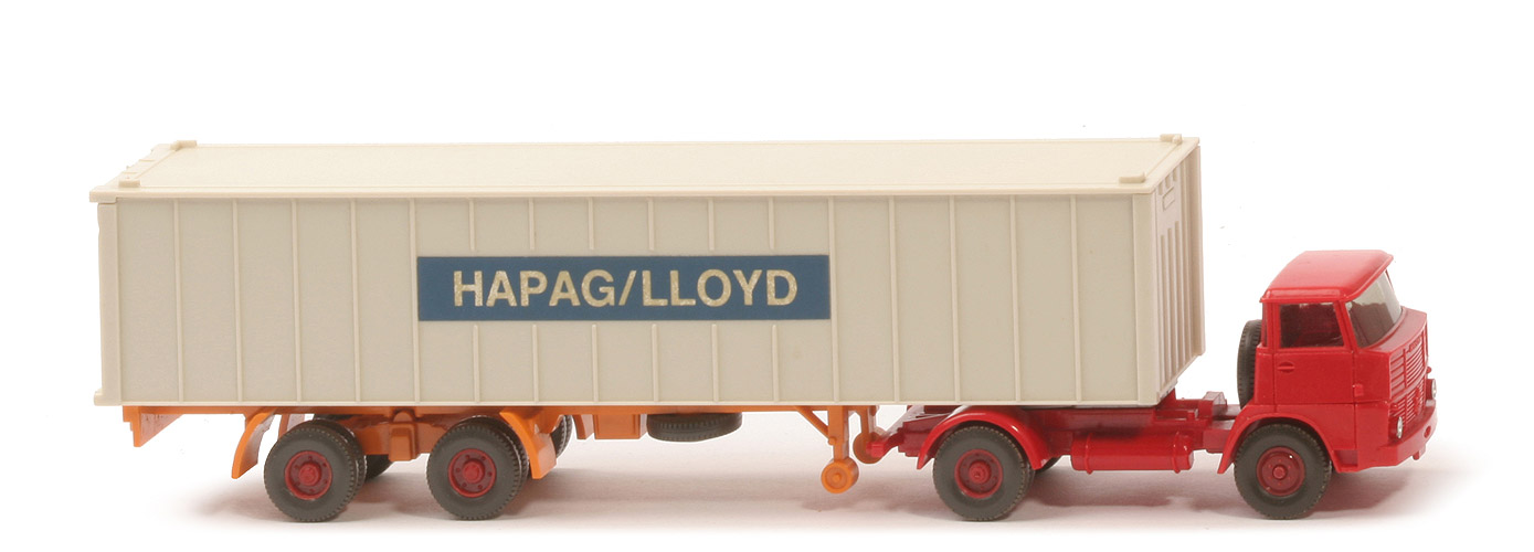 | Zugmaschine | Kabine oben | rot | Kabine unten | rot | Verglasung | getönt | Chassistyp | alt | Zughaken | ohne | Fläche hinter Sattelpfanne | geriffelt | Chassisfarbe | rot | Sattelpfanne | neu, für dünnen Bolzen | Reserverad | flach hinter Kabine | Räder | 12mm, Profil fein | Felgen | hellbraunrot | | Container | Art | 1 x 40 ft, gerippt | Dach | perlweiß | Korpus | perlweiß | Türen | perlweiß | Unterkante | schmal | Beschriftung | Hapag-Lloyd (s. Foto) | Beschriftung Grösse | 7 Felder, Papieraufkleber | | Auflieger | Farbe | gelborange (Werbe) | Unterfahrschutz | ohne | Königsbolzen | dünn | Räder | 12mm, Profil fein | Felgen | hellbraunrot |