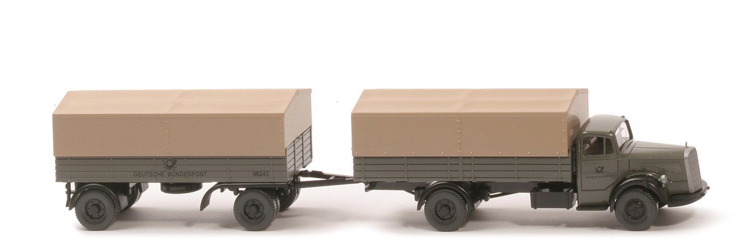 | Zugwagen | Fahrerhaus | "zeltgrau" | Warndreieck auf Dach | ohne | Verglasung | klar | Inneneinrichtung | ca. basaltgrau | Lenkrad | separiert | Türdruck | Posthorn, "Deutsche Bundespost" | Grill | silbern eingesetzt | Scheinwerfer | silbern eingesetzt | Kotflügel | schwarz | Chassis | schwarz | Kardanelement | schwarz | Bodenprägung | neues WIKING-Logo | Reserverad | unter Chassis | Kotflügel hinten | schwarz | Pritsche | "zeltgrau" | Plane | graubeige | | Anhänger | Pritsche | "zeltgrau", Druck siehe Kommentar | Pritscheneinlage | ohne | Plane | graubeige | Chassis | schwarz, filigran, mit Zughaken | Drehschemel | schwarz | Bodenprägung | ohne | Reserverad | unter Chassis geklebt | Deichsel | schwarz, Kunststoff, ohne Bremsstange | | Räder | Typ | 12 mm, 2-teilig | Felgen | 6-Loch, schwarz | | Link | ähnliches Modell | aus PMS Edition 1994 |