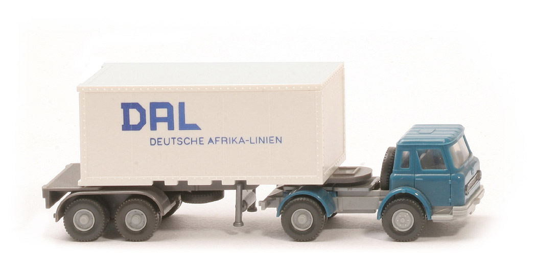 | Zugmaschine | Kabine | azurblau | Lüfter | mit | Inneneinrichtung | silbergrau | Verglasung | klar | Chassis | silbergrau | Radlauf hinten | azurblau | Sattelpfanne | für großen Königsbolzen | Reserverad | hinter Kabine | Räder | Profil grob | Felgen | silbergrau | | Container | Art | 20 ft Glattwand | Farbe | weiß | Türen | alt | Beschriftung | DAL (ohne Nummer) | Beschriftung Art | Druck stahlblau | | Auflieger | Farbe | basaltgrau | Variante | mit Markierung, mit Bohrungen neben KoBo | Reserverad | unter Auflieger, gesteckt | Bodenprägung | 52h | Doppelachsaggregat Farbe | basaltgrau | Doppelachsaggregat Typ | Klemmplatte WIKING u. GERMANY | Hydraulikstützen | silbern, gesteckt | Räder | Profil grob | Felgen | silbergrau |