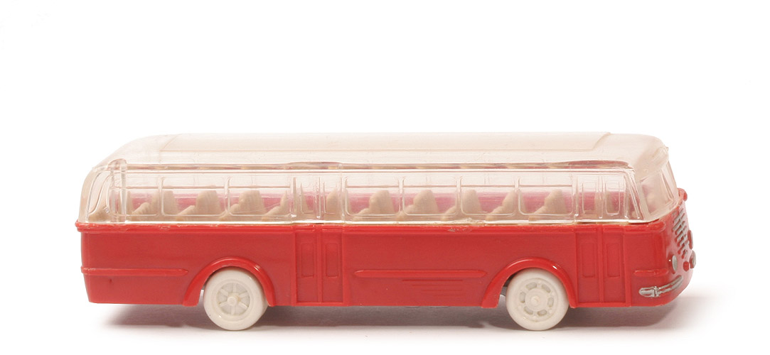 Bemalung: nur Scheinwerfer, Grill, Stoßstange. Rot mit integriertem BÜSSING-Schriftzug nicht im GK. Von orangerot deutlich unterscheidbar. Sehr selten. Hier mit Rädern und Lenkrad in weiß und mit Inneneinrichtung beige. |