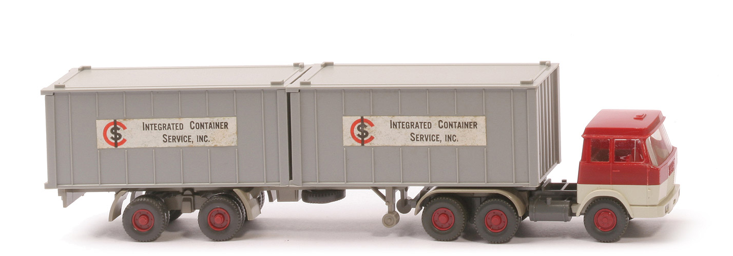 | Zugmaschine | Kabine oben | hellbraunrot | Kabine unten | perlweiß | Verglasung | klar | Inneneinrichtung | 3 Sitze, rot (!) | Lenkrad | ohne | Chassis | basaltgrau | Radlauf hinten | olivgrau, 1-teilig | Sattelpfanne | für großen Königsbolzen | Reserverad | ohne | Räder | Profil grob | Felgen | hellbraunrot | | Container | Art | 2 x 20 ft gerippt | Farbe | platingrau | Beschriftung | ICS (s. Foto) | Beschriftung Art | 5 Felder, Papieraufkleber | | Auflieger | Farbe | olivgrau (wie Serie) | Unterfahrschutz | ohne | Königsbolzen | stark | Räder | Profil grob | Felgen | hellbraunrot |