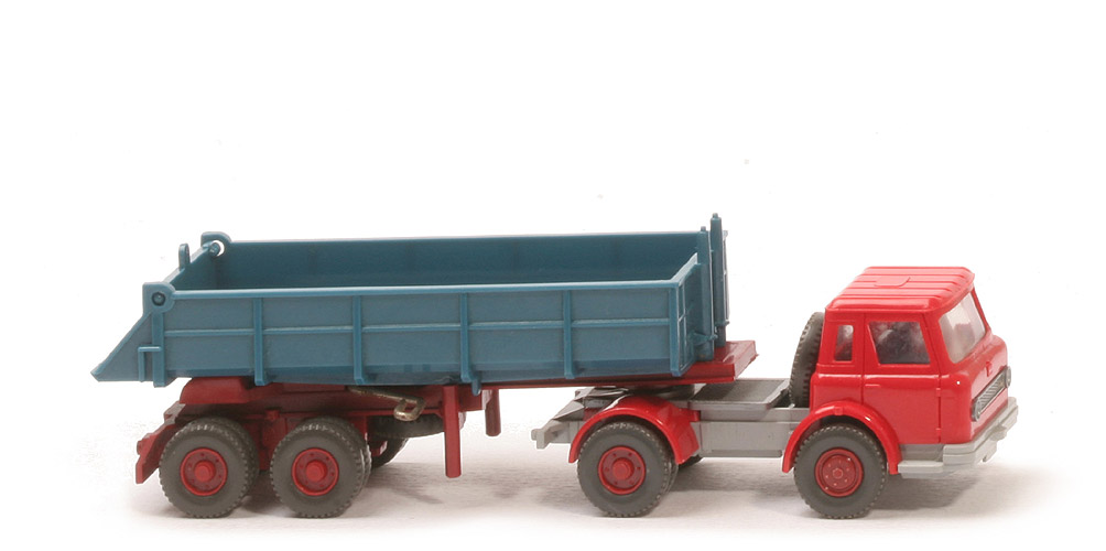 | Zugmaschine | Farbe Kabine | rot | Lüfter | mit | Inneneinrichtung | silbergrau | Verglasung | klar | Chassis | silbergrau | Radlauf hinten | rot | Sattelpfanne | für großen Königsbolzen | Reserverad | hinter Kabine | Räder | 12mm, Profil fein | Felgen | hellbraunrot | | Auflieger | Farbe Mulde und Klappe | azurblau | Farbe Chassis | rubinrot | Bodenprägung Chassis | Wiking Germany | Farbe Scharnierhalterung | rubinrot | Farbe Achshalterung | hellbraunrot | Bodenprägung Achshalterung | 67 S | Königsbolzen | stark | Reserverad | unter Chassis | Räder | 12mm, Profil grob | Felgen | hellbraunrot |
