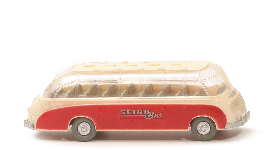 Dies ist das Setra-Werbemodell, was man schon mal häufiger sieht. Es ist die einzige gesichtete Variante aller Setras, bei der die Farbe des Chassis von der der Sitze so deutlich abweicht. |