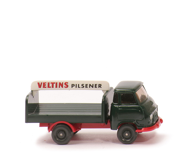 Kabine | schwarzgrün | Verglasung | klar | Bedruckung Scheinwerfer | silbern | Bedruckung Grill | ohne | Bedruckung Kennzeichen | ohne | Inneneinrichtung | ohne | Chassis | rot | Bodenprägung | WIKING Germany | Aufbau | schwarzgrün | Steg | weiß | Bodenprägung Aufbau | WIKING | Rückleuchten | unbemalt | Nummernschild hinten | unbemalt | Beschriftung Türen | ohne | Beschriftung Steg | "Veltins Pilsener" (s. Foto) | Beschriftung Heck | "Veltins Pilsener" weiß | Ladegut | ohne, Getränkekästen in der Packung | Räder | 9 mm, glatt | Räder Farbe | anthrazit |