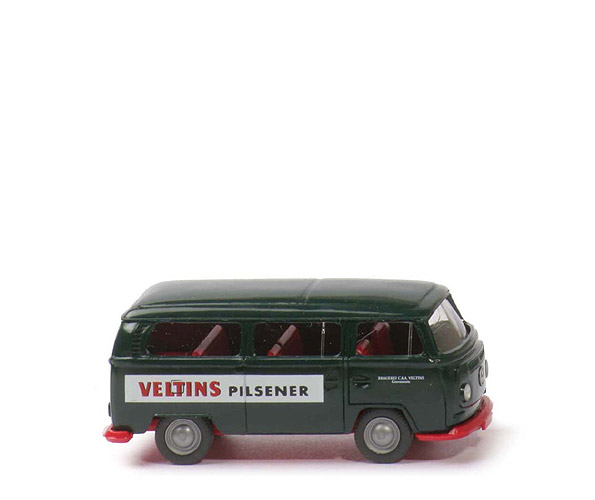 Karosserie | dunkelgrün | Türgriffe | vertieft | Verglasung | klar | Inneneinrichtung | rot | Lenkrad | hier eingesetzt (alte Modelle ohne) | Bemalung Scheinwerfer | silbern | Bemalung Rückleuchten | ohne | Beschriftung | Veltins .... (s. Foto) | Beschriftung Art | Druck | Chassisfarbe | rot | Bodenprägung | Wiking (neues Logo), Germany | Räder | Nabe silbern eingesetzt |