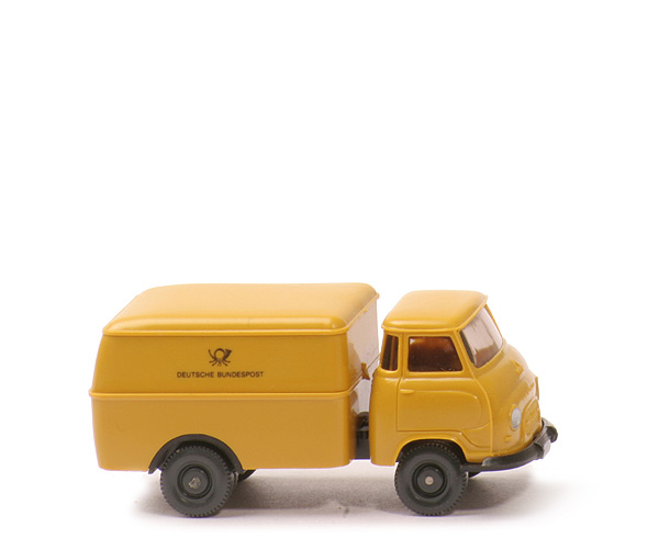 Kabine | ca. hellgelb | Verglasung | klar | Bedruckung Scheinwerfer | silber | Bedruckung Grill | ohne | Bedruckung Türen | ohne | Inneneinrichtung | ohne | Chassis | schwarz | Bodenprägung | Wiking Germany (alt!) | Kofferdach | ca. hellgelb | Koffer oben | ca. hellgelb | Koffer unten | ca. hellgelb | Bedruckung Rückleuchten | ohne | Bedruckung Kennzeichen hinten | ohne | Bedruckung Koffer oben | Posthorn, "Deutsche Bundespost" | Bedruckung Koffer unten | ohne | Räder | 9 mm, einteilig | Ladegut | ohne |