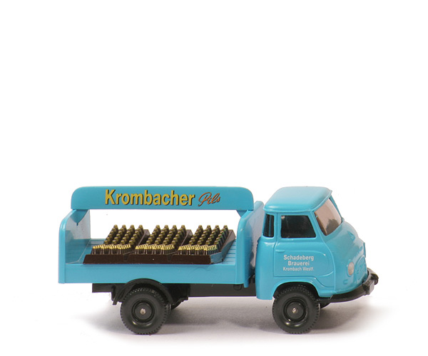 Kabine | adriablau | Verglasung | leicht getönt | Bedruckung Scheinwerfer | silbern | Bedruckung Grill | ohne | Bedruckung Kennzeichen | ohne | Inneneinrichtung | ohne | Chassis | rot | Bodenprägung | WIKING Germany | Aufbau | adriablau | Steg | adriablau | Bodenprägung Aufbau | WIKING | Rückleuchten | unbemalt | Nummernschild hinten | unbemalt | Beschriftung Türen | "Schadeberg, Brauerei Krombacher Westf." | Beschriftung Steg | "Krombacher Pils" (s. Foto) | Beschriftung Heck | ohne | Ladegut | 3x2 Getränkekkästen schokobraun, Kronkorken gold | Befestigung Ladegut | geklebt | Räder | 9 mm, glatt | Räder Farbe | anthrazit |