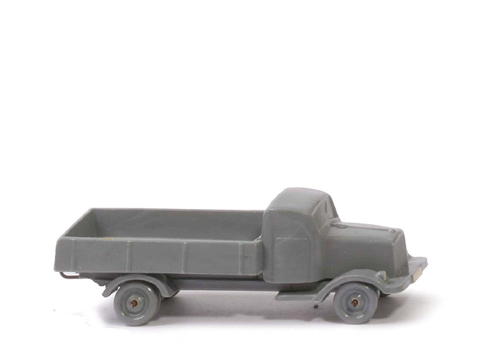 Achsen | Drahtachser | Aufbau | staubgrau | Stoßstange | anliegend | Seitenlüfter Motorhaube | ohne | Scheibenwischer | mit | Winker | ohne | Querverbretterung Pritsche | ohne | Chassis | staubgrau | Bodenprägung | WM, darunter: MADE IN GERMANY | Zughaken | Draht, ins Chassis eingelassen | Bemalung Scheiben | ohne | Bemalung Scheinwerfer vorne | weiß | Bemalung Kennzeichen vorne | weiß | Bemalung Kennzeichen hinten | weiß | Bemalung Rückleuchte | ohne | Räder Typ | 10 mm, ohne Profil | Räder Farbe | staubgrau |