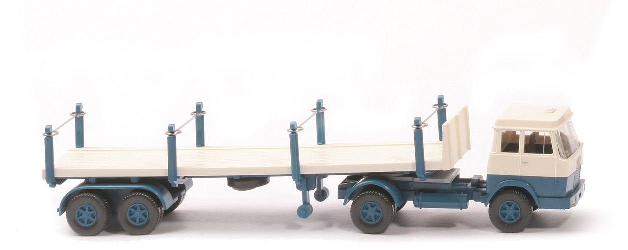 | Zugmaschine | Kabine oben | perlweiß | Kabine unten | azurblau | Verglasung | klar | Inneneinrichtung | 2 Sitze, Motorblock, ca. basaltgrau | Lenkrad | mit | Chassis | 2-achsig, o. Rücklichtstange, azurblau | Bodenprägung | WM, Germany | Radlauf hinten | azurblau | Sattelpfanne | für großen Königsbolzen | Reserverad | unter Chassis | Räder | Profil grob | Felgen | Trilex, azurblau | | Auflieger | Farbe Pritsche | perlweiß | Farbe Chassis | azurblau | Bodenprägung Chassis | neues WIKING-Logo, 51r | Achseinheit Farbe | azurblau | Typ Achseinheit | Klemmplatte Wiederauflage | Achseinheit Kennzeichen | mit | Rungen | azurblau | Königsbolzen | stark | Räder | Profil grob | Felgen | Trilex, azurblau |