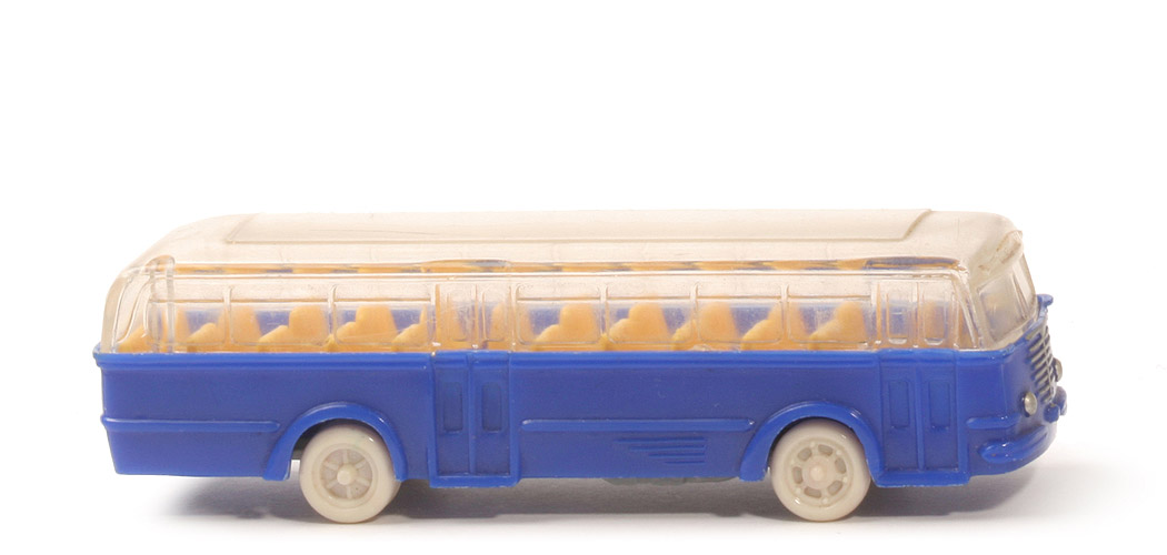 | | Karosserie | | Typ Karosserie | Typ 1 | | Farbe | dunkelultramarin | | Scheinwerfer | konvex | | Grill | alt | | unterer Türabschluss | tiefer als Karosserie | | angedeutete Fenster in Türen | gerundet | | Heck | Version 2 | | Heckbeschriftung BÜSSING | dünn, die beiden "S" größer als Restschrift | | Rückleuchten | ohne | | Nummernschild hinten | ohne | | Bodenprägung | ohne | | Chassishalterungen | eckig | | | Dach | | Typ Dach | glatt, ohne Lüfter | | Fenster | gerundet | | | Inneneinrichtung | | Typ Inneneinrichtung | Sitze grob | | Farbe | gelb | | Lenkrad | an Karosserie, 2-speichig | | Lenkrad Farbe | helles cremeweiß | | Fahrer | ohne | | | Chassis | | Bodengruppe | Typ 1 | | Chassis Farbe | staubgrau | | | Räder | | Typ | Trilex | | Farbe | helles cremeweiß |