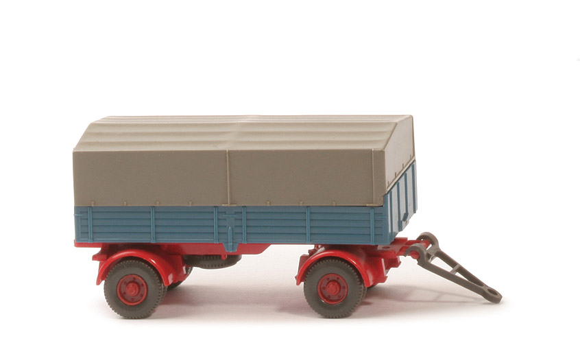 | Pritsche | Typ | hoch, Stirnwand erhöht, Unterseite glatt | Farbe | azurblau | Pritscheneinlage | silbern | | Chassis | Typ | Basis geschlossen | Farbe | rot | Bodenprägung | WIKING, Made in Germany, 40 g | Zughaken | integriert | Drehschemel | rot | Radlauf vorne | Typ 3, rot | Radlauf hinten | Typ 3, rot | Nummernschild | an der Rücklichtstange des Chassis | | Plane | Typ | hinten offen, gerafft | Unterversion | mit Mittelsteg, Stecklaschen: hinten 2, vorne durchgehend | Prägung | WM, Nestkennung 4 Punkte | Farbe | steingrau | | weitere Details | Reserverad | unter Chassis (12 mm, Profil fein, o. Felgeneinsatz) | Deichsel | angesteckt, Kunststoff | Bemalung Nummernschild | ohne | Bemalung Rückleuchten | ohne | Räder Typ | 12 mm, feines Profil | Felgen | 6-Loch, weinrot |