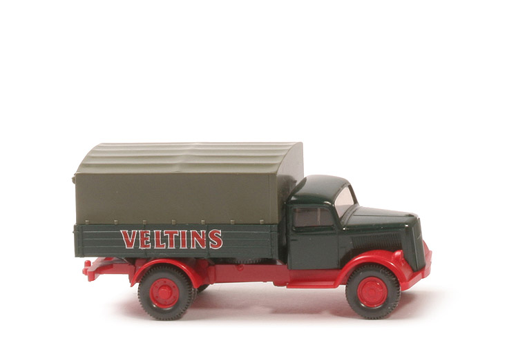 Kabine | ca. schwarzgrün | Verglasung | klar | Blitz auf Grill | mit | Chassis Farbe | rot | Chassis Bodenprägung | altes WIKING-Logo, neues Germany | Zughaken | integriert, klein | Chassis hinten | offen | Reserverad | unter Pritsche mittig | Pritsche | ca. schwarzgrün | Pritsche Bodenprägung | 3350, WIKING Germany | Pritscheneinlage | ca. lichtgrau | Bedruckung Pritsche | "Veltins" | Räder | 11mm, Profil fein, 2-teilig | Felgen | rot eingesetzt | Plane | ca. olivgrün |