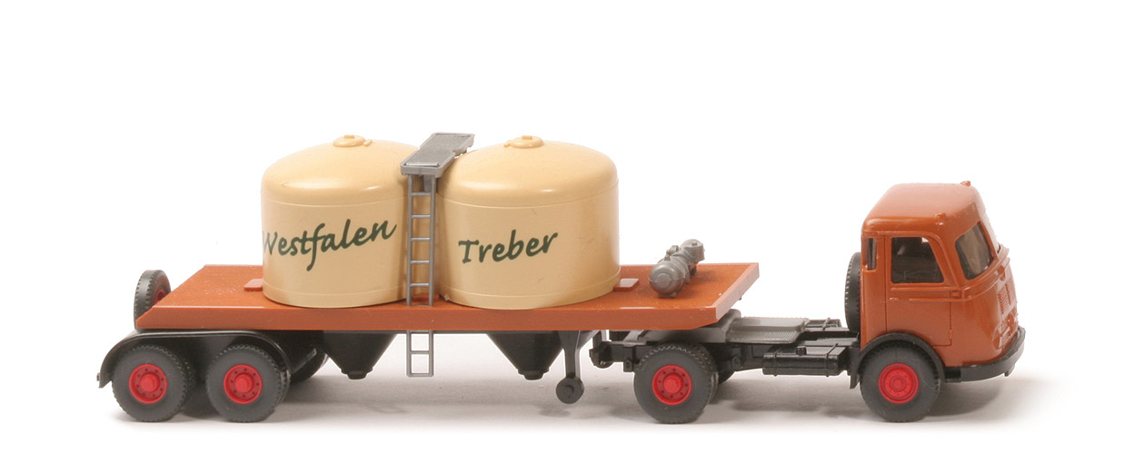 | Zugmaschine | Kabine Farbe | rostbraun | Fenstersteg | breit | Fixierung Reserverad | mit | Verglasung | klar | Inneneinrichtung | schwarz | Grill | integriert | Chassis | schwarz | Bodenprägung | neues Wiking-Logo | hintere Stoßstange links | mit | Zughaken | ohne | hintere Stoßstange rechts | mit | Reserverad | hinter Kabine | Sattelpfanne | für großen Bolzen mit Steg | Werkzeugkiste | ohne | Räder | 12mm, Profil grob, neu | Felgen | 8-Loch. rot | | Auflieger | Tanks | hellbeige | Aufbau | rostbraun | Chassis | schwarz, BP WIKING, 53 n | Königsbolzen | stark | Leitern, Pumpeinheit | silbern | Achseinheit | schwarz | Typ Achseinheit | neues Wiking-Logo | Stützrollen | schwarz | Reserverad | hinten senkrecht verklebt | Beschriftung | "Westfalen Treber" (s. Foto) | Art der Beschriftung | Druck | Räder | 12mm, Profil grob, neu, Felgen 8-Loch rot |