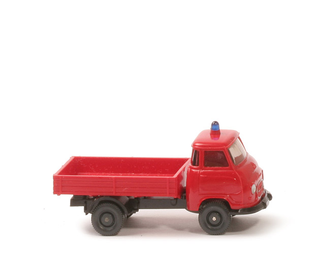 Kabine | rot, Warnlicht blautransparent auf Sockel rot | Verglasung | leicht getönt | Bemalung Scheinwerfer | silber | Bemalung Grill | Umrandung, Zierlinien, "Kurier" silber | Bemalung Kennzeichen | ohne | Inneneinrichtung | ohne | Chassis | schwarz | Bodenprägung | Wiking Germany | Pritsche | rot | Rückleuchten | unbemalt | Nummernschild hinten | unbemalt | Plane | ohne | Räder | 9 mm, glatt, anthrazit |