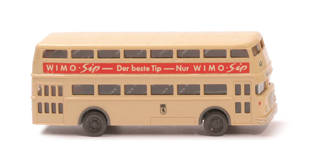 | Karosserie Farbe | hellbeige | | Karosserie Typ | Einstieg hinten geschlossen | | Verglasung | klar | | Fahrer Farbe | ca. anthrazit | | Fahrer Typ | mit Lenkrad vergossen | | Fahrer Bemalung | Gesicht, Hände | | Fahrersitz | ca. resedagrün | | Sitze Farbe | ca. resedagrün | | hintere Fahrgastraumbegrenzung | ohne | | Treppe hinten | ohne | | Chassis Farbe | ca. staubgrau | | Kardanelement Farbe | ca. staubgrau | | Version Chassis | ohne kreisrunde Verstärkung | | Bodenprägung | WM | | Werbebeschriftung | Wimo Sip ... (s. Foto) | | Zielbeschriftung vorne | 48 Zehlendorf schwarz auf weiß | | Stadtwappen | schwarz | | Art der Beschriftung | Abziehbilder | | Bemalung vorne | Scheinwerfer, Büssing-Spinne, Stoßstange silber | | weitere Bemalung | vorne Blinker rot, 4 Rückleuchten rot | | Räder Typ | 12 mm, Profil grob | | Felgen | 6-Loch, anthrazit |