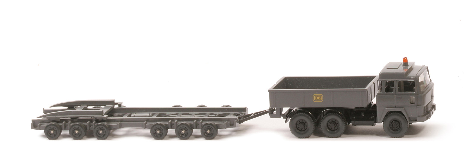 | Kabine oben | basaltgrau | | Kabine unten | basaltgrau | | Gelblicht | mit | | Verglasung | klar | | Inneneinrichtung | ca. lichtgrau | | Lenkrad | mit | | Grill | schwarz | | Chassis | schwarz | | Radlauf hinten | schwarz, 2-teilig | | Sattelpfanne | für großen Königsbolzen | | Reserverad | ohne | | Pritsche | basaltgrau | | Pritscheneinlage | ohne | | Bedruckung | DB-Keks, gelb | | Räder | 12mm, Profil grob | | Felgen | 8-Loch, schwarz | | | Anhänger | | Farbe | basaltgrau | | Deichsel | Kunststoff, anthrazit | | Bodenprägung | Wiking Germany und WM im Kreis | | Räder | Trilex-Felgen, mit Profil | | Farbe Räder | anthrazit |