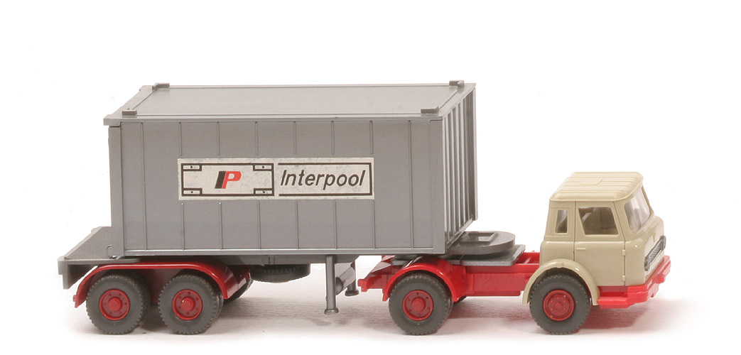 | Zugmaschine | Kabine | hellgelbgrau | Lüfter | mit | Inneneinrichtung | hellgelbgrau | Verglasung | klar | Chassis | rot | Radlauf hinten | rot | Sattelpfanne | für großen Königsbolzen | Reserverad | ohne | Räder | Profil grob | Felgen | hellbraunrot | | Container | Art | 20 ft gerippt | Farbe | silbern | Türen | alt | Beschriftung | Interpool (s. Foto) | Beschriftung Art | Papieraufkleber, Druck schwarz/rot | | Auflieger | Farbe | basaltgrau | Variante | mit Markierung, mit Bohrungen neben KoBo | Reserverad | unter Auflieger, gesteckt | Bodenprägung | 52h | Doppelachsaggregat Farbe | hellbraunrot | Doppelachsaggregat Typ | Klemmplatte WIKING u. GERMANY | Hydraulikstützen | silbern, gesteckt | Räder | Profil grob | Felgen | hellbraunrot |