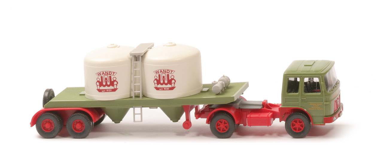 | Zugmaschine | Fahrerhaus | helles resedagrün | Verglasung | klar | Inneneinrichtung | schwarz, mit Lenkrad | Spiegel | mit | Scheibenwischer | mit | Lüftergitter | ohne | Grill | "karminrot", mit Löwe | Motorblock | "karminrot" | Chassis | "karminrot", neu | Sattelpfanne | alt, mit Steg, für großen, ähnlich KöBo | Radlauf hinten | "karminrot" | | Auflieger | Tanks | weiß | Basis | helles resedagrün | Königsbolzen | stark | Bodenprägung Auflieger | WIKING (altes Logo), 53 n | Leitern | ca. silbergrau | Pumpeinheit | ca. silbergrau | Achseinheit | "karminrot" | Typ Achseinheit | Klemmplatte Wiederauflage | Stützrollen | "karminrot" | Reserverad | hinten senkrecht auf Achseinheit | Beschriftung | Wandt ... (s. Foto) | Art der Beschriftung | Druck | | Räder | Typ | 12mm, Profil grob | Felgen | ZM Trilex, Aufl. 8-Loch, "karminrot" |