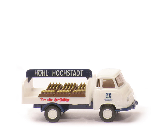Kabine | weiß | Verglasung | leicht getönt | Bedruckung Scheinwerfer | silber | Grill | unbemalt | Bedruckung Kennzeichen | ohne | Inneneinrichtung | ohne | Chassis | hellstahlblau | Bodenprägung | WIKING Germany (alt) | Aufbau | weiß | Steg | hellstahlblau | Bodenprägung Aufbau | WIKING und neues Wiking-Logo | Rückleuchten | unbemalt | Nummernschild hinten | unbemalt | Beschriftung Türen | "Wihelm Höhl, Hochstadt" | Beschriftung Steg | "Höhl, Hochstadt" | Beschriftung Heck | "Der alte Hochstädter, "Speyerling", "Aepfelwein" | Ladegut | 3x2 Getränkekästen lehmbraun | Räder | 9 mm, Felge eingesetzt | Felgen | weiß |
