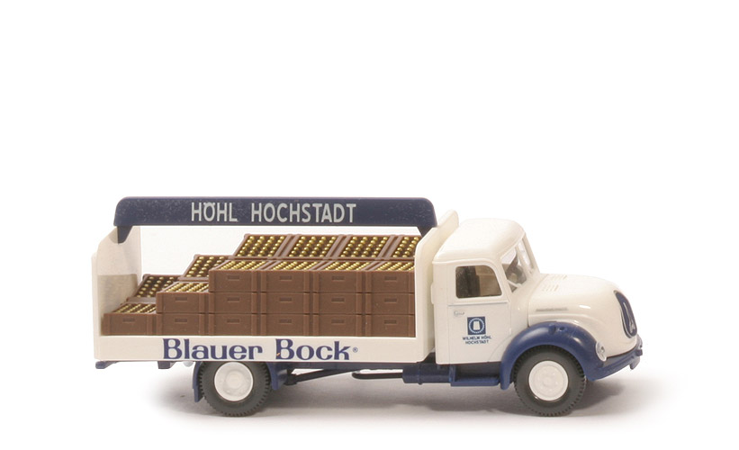 Farbe Kabine | weiß | Verglasung | klar | Inneneinrichtung | ca. anthrazit | Lenkrad | separat eingesetzt, ca. anthrazit | Grill | separat eingesetzt, hellstahlblau | Bedruckung Grill | Umrandung, Magirus-Logo silbern | Scheinwerfer | klar transparent, eingesetzt | Farbe Chassis, Kotflügel | hellstahlblau | Auspuffanlage | hellstahlblau | Bodenprägung | neues WIKING-Logo | Zughaken | klein | Aufbau | weiß | Steg | hellstahlblau | Reserverad | ohne | Beschriftung Türen | "Wihelm Höhl, Hochstadt", Logo | Beschriftung Aufbau seitlich | "Blauer Bock" | Beschriftung Aufbau hinten | "Blauer Bock", Logo | Beschriftung Steg | "Höhl, Hochstadt" | Ladung Typ | verklebter neuer Getränkekisteneinsatz | Ladung Farbe | ca lehmbraun, Kronkorken gold | Räder | 11 mm, zweiteilig | Felgen | 6-Loch, weiß |