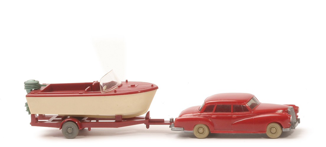| Zugwagen | Farbe Karosserie | weinrot | Seitenholme | Teil der Karosserie | Verglasung | getönt | Bemalung Scheinwerfer | silbern | Bemalung Rückleuchten | ohne | Bemalung Kennzeichen hinten | ohne | Grill | silbern eingesetzt, mit Stern | Verglasung | getönt | Inneneinrichtung | ohne | Kofferraumdeckel | mit Stern | Chassis Farbe | silbern | Achshalterungen | geschlossen | Zughaken | angeklebt, Basis eckig | Bodenprägung | WIKING | Räder Art | Nabe gewölbt | Räder Farbe | ca. gelbgrau - wahrscheinlich vergilbt | | Boot | Bootoberseite | weinrot | Rumpf | weiß | Deck | silbern | hier Bodenprägung | WM | Außenborder | grünmetallic | Windschutzscheibe | klar, groß | Halterung | ohne | | Trailer | Grundfarbe | weinrot | Räder | basaltgrau, Nabe gewölbt |