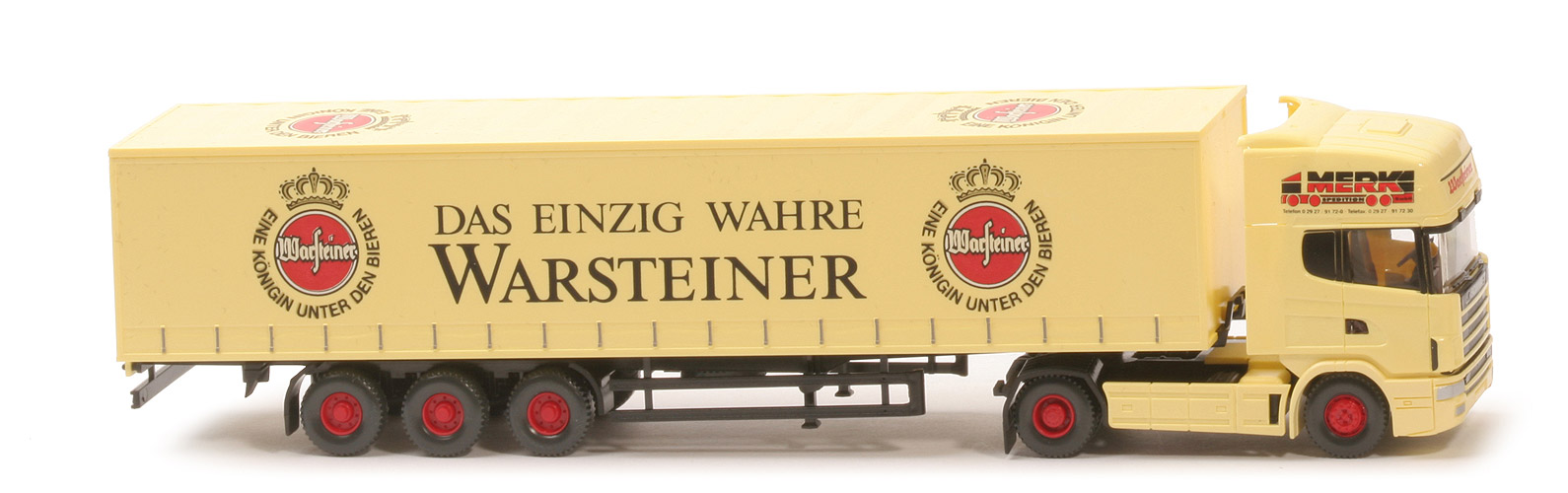 | Zugwagen | Dach | schwefelgelb, Frontdruck "Warsteiner" | Kabine | schwefelgelb | Verglasung | klar | Inneneinrichtung | schwarz, Lenkrad separat | Fensterrahmen, Wischer | schwarz bedruckt | Grill | schwarz eingesetzt, "Scania" silber | Scheinwerfer | silbern | Druck Typenbezeichnung | "144 L" und "530", silbern | Stoßstange, Radlauf vorn | schwefelgelb | Seitenverkleidung | schwefelgelb | Chassis, Kardanelement | schwarz | hier Bodenprägung | neues WIKING-Logo, Germany | Sattelpfanne | Teil des Chassis | Kotflügel hinten | schwarz | Reserverad | unter Chassis | | Auflieger | Aufbau Dach | schwefelgelb | Aufbau Korpus | schwefelgelb | Chassis | schwarz | Kotflügel | schwarz | Unterfahrschutz Seite/hinten | schwarz | Stützen | schwarz | Beschriftung Aufbau Seiten | "Das einzig Wahre - Warsteiner", Logo | Beschriftung Aufbau hinten | "Warsteiner", Logo | Beschriftung Aufbau Dach | 2x Logo (ohne Unterschriften) | | Räder | Typ | 12mm, Felgen eingesetzt | Felgen | 8-Loch, rot | | Link | zum Schwestermodell | mit Unterschriften auf Dach |