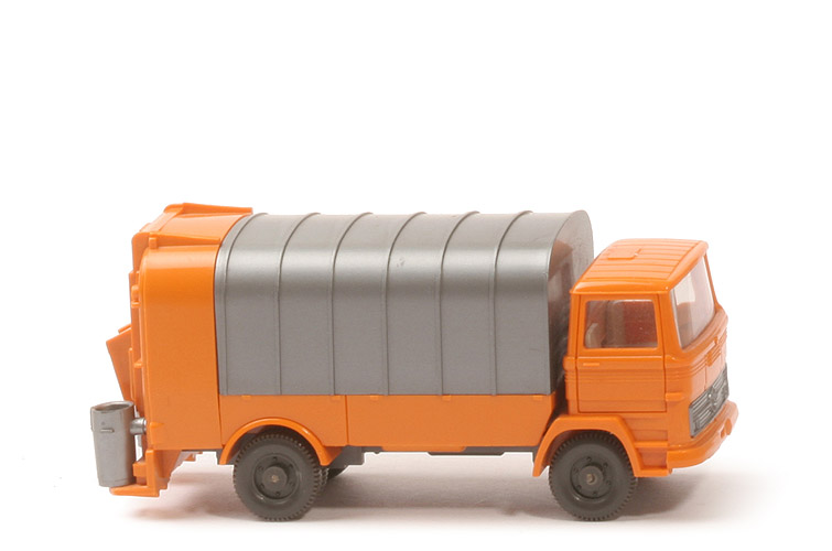 Kabine | gelborange | Spiegel | ohne | Grill | silbern mit Stern | Verglasung | klar | Inneneinrichtung | ca. lichtgrau | Lenkrad | ohne | Chassis | ca. basaltgrau | Druckluftbehälter | Hahn breit | Radlauf hinten | gelborange | Trommel | silbern | Trommelunterbau | gelborange | hier Bodenprägung | 64n | Heckteil des Aufbaus | gelborange | Prägung "KUKA" | mit | Rückleuchten | erhaben | Aussparung vor Trittbrett | mit | Mülltonnen | 2 gesteckt, silbern | Beschriftung | ohne | Bemalung | ohne | Räder | 11mm, 6 Loch |