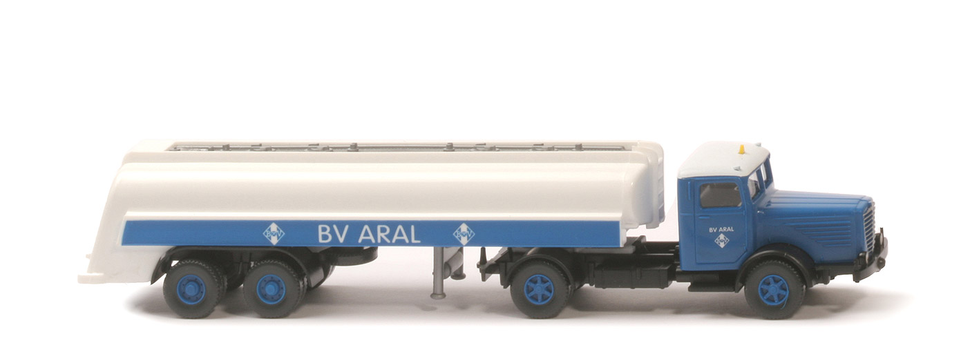 | Zugmaschine | Kabine | "verkehrsblau", Dach weiß bedruckt | Verglasung | klar | Inneneinrichtung | schwarz | Scheinwerfer | gesilbert | Grill | gesilbert, schwarz hinterlegt | Warndreieck | gelb | Bedruckung Türen | BV Aral, BV Emblem | Chassis Farbe | schwarz | Sattelpfanne | lichtgrau (!), für großen Königsbolzen, schmal mit Griff | Bodenprägung | neues WIKING-Logo, Germany | Zughaken | klein | Reserverad | ohne | Kotflügel vorne und hinten | schwarz | Räder Typ | 12 mm, Felgen eingesetzt | Felgen | Trilex, "verkehrsblau" | | Auflieger | Farbe | weiß | Leiter | nicht gesilbert | Farbe Füllanlage | silbern | Farbe Armaturen | silbern | Farbe Chassis | silbern | Bedruckung Seite | BV Aral, BV Emblem in Streifen in "verkehrsblau" | Bedruckung Heck | BV Emblem | DAA Farbe | schwarz | DAA Typ | Klipsachsen | Bodenprägung Chassis | nur Wiking | Reserverad | gesteckt | Räder Typ | 12 mm, Felgen eingesetzt | Felgen | Trilex, "verkehrsblau" |