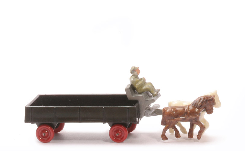Räder | Drahtachser | Pritschentyp | ohne Querverbretterung | Farbe Pritsche | schwarz | Deichselrest | mit | Pritschenboden | glatt | Zughaken | ohne | Deichsel/Kutschbock | silbern | Quersteg Deichsel | mit | Farbe linkes Pferd | cremeweiß | Farbe rechtes Pferd | mischbraun | Kutscher Typ | Mütze | Kutscher Farbe | helles lindgrün | Kutscher Bemalung | Gesicht, Hände | Räder | rot |