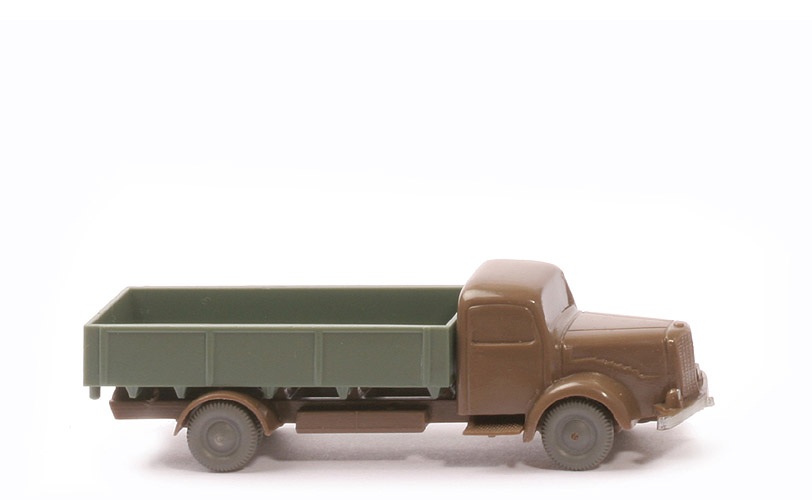 Achsen | Rollachser | Farbe Kabine u. Chassis | blassbraun | Verstärkung Trittbretter | mit | Bemalung Kabine | Scheinwerfer, Stoßstange | Version Chassis | Version 1b | Chassis Farbe | blassbraun | Bodenprägung | WM im Kreis | Pritsche | Seiten glatt | Farbe Pritsche | dunkelresedagrün | Zughaken | nach unten | Zapfen | Flachzapfen | Kennzeichen | bemalt silbern | Befestigung Pritsche | geklebt | Räder | 10mm, mit Profil |