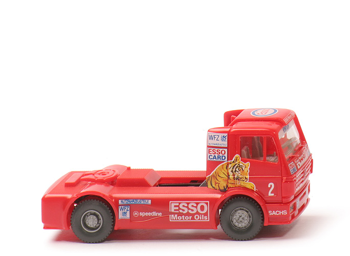 Modell aus der Packung Dehnhardt (1). In der Packung befindet sich noch ein Albedo Renntruck-Transporter. Hier also: ESSO-2-Truck. Markant: Startnummer 2, Windleitblech auf dem Dach in orangerot. |