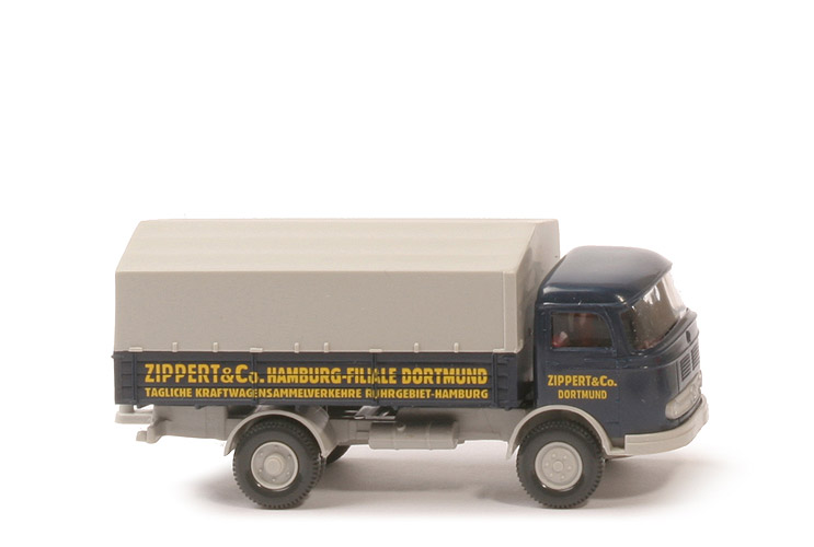 Aus dem Set "Mercedes-Benz – Partner der Transportwirtschaft - Meilensteine der Wiking-Geschichte". Endlos langer Pritschendruck: "Zippert & Co. Hamburg – Filiale Dortmund, tägliche Kraftwagen- sammel-Verkehre Ruhrgebiet-Hamburg". |
