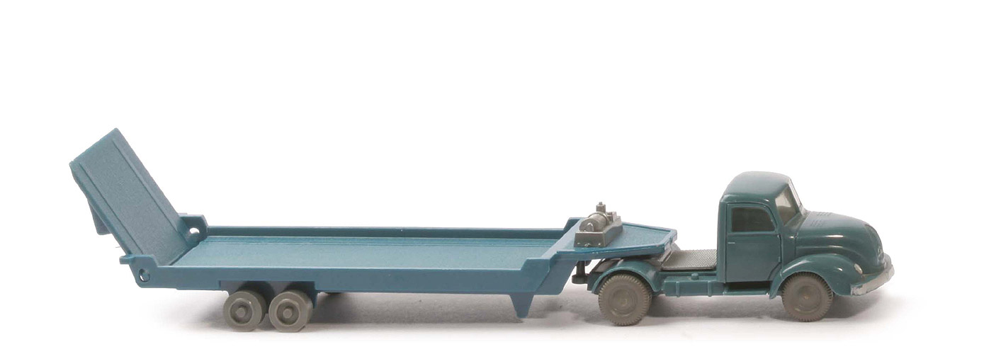 | | Zugmaschine | | Farbe Kabine | dunkelblaugrau | | Version Kabine | Typ 3 | | Stoßstange | abgeschrägt | | Kabinenboden | ohne Schlitz | | Verglasung | getönt | | Chassis Farbe | dunkelblaugrau | | Chassis Typ | Version 2 | | Bemalung | völlig ohne | | Sattelpfanne | alt, ohne Steg, für kleinen KöBo | | Achshalterungen | geschlossen | | Bodenprägung | WM (ohne Kreis) | | Reserverad | ohne | | Räder | 10 mm, ältere Ausführung | | | Auflieger | | Typ | vorn eckig (Typ B) | | Seilwinde | mit | | Knopf vor Seilwinde | ohne | | Rückleuchten | ohne | | Bodenprägung | WM-Wiking-Made in Germany | | Räder | Walzenräder |