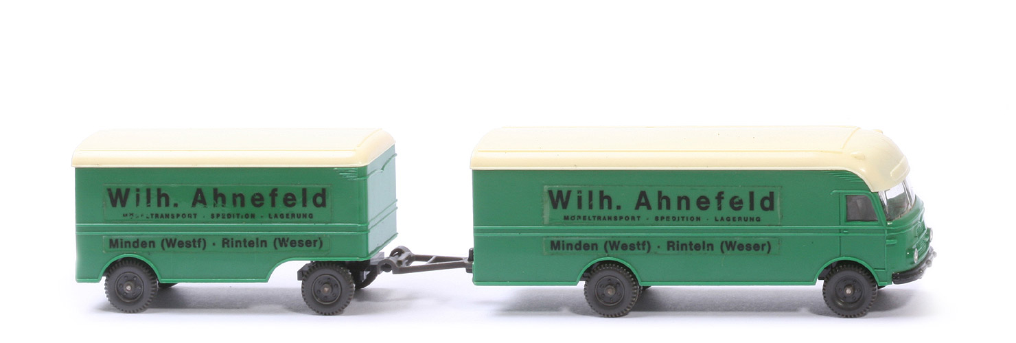 | Zugwagen | Aufbau Farbe | helles laubgrün | Blinker vorne | mit | Verglasung | klar | Inneneinrichtung | schwarz | Fahrer | ohne | Kotflügel | Teil des Aufbaus | Rückleuchten | klein | Dach Farbe | creme | Dach Art | matt, mit Positionsleuchten, mit Streben | Türen | creme | Türen Art | Typ 3: niedrig, mit Streben, mit Griff | Chassis Art | Typ 4 | Chassis Farbe | schwarz | Bodenprägung Motorblock | Punkt | Bodenprägung hinten | WIKING GERMANY | Achshalterung vorne | offen | Achshalterung hinten | offen | Fläche unter hinterem Kardan | geschlossen | Fläche hinter Hinterachse | geschlossen | Tank | mit | | Anhänger | Aufbau Farbe | helles laubgrün | Kotflügel | Teil des Aufbaus | Dach Farbe | creme | Dach Art | matt, mit Streben | Türen | creme, hoch, neu | Chassis Farbe | schwarz | Bodenprägung | WIKING GERMANY ohne 50a | Beschriftung | Ahnefeld... (s. Foto), Folie | Räder | 11mm 6-Loch Profil grob |